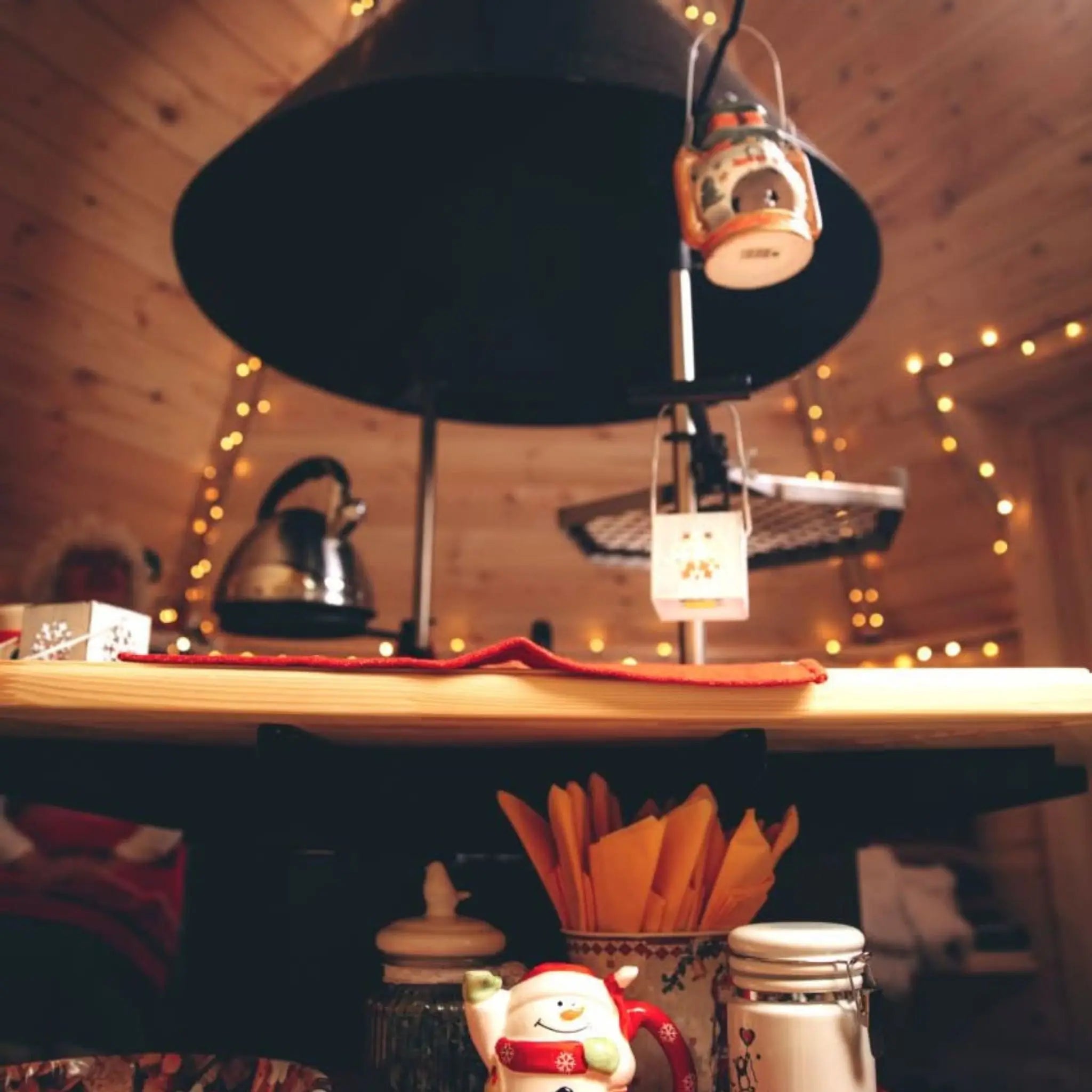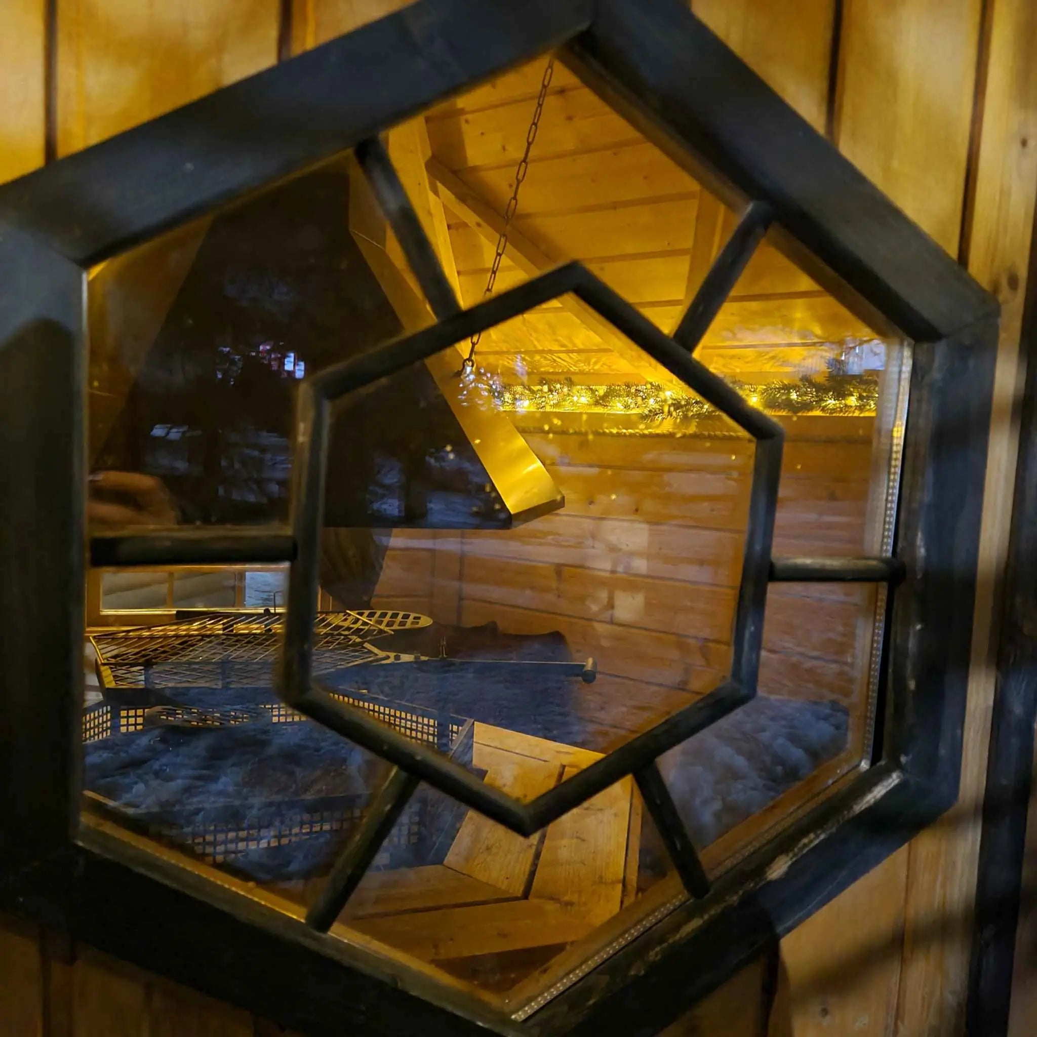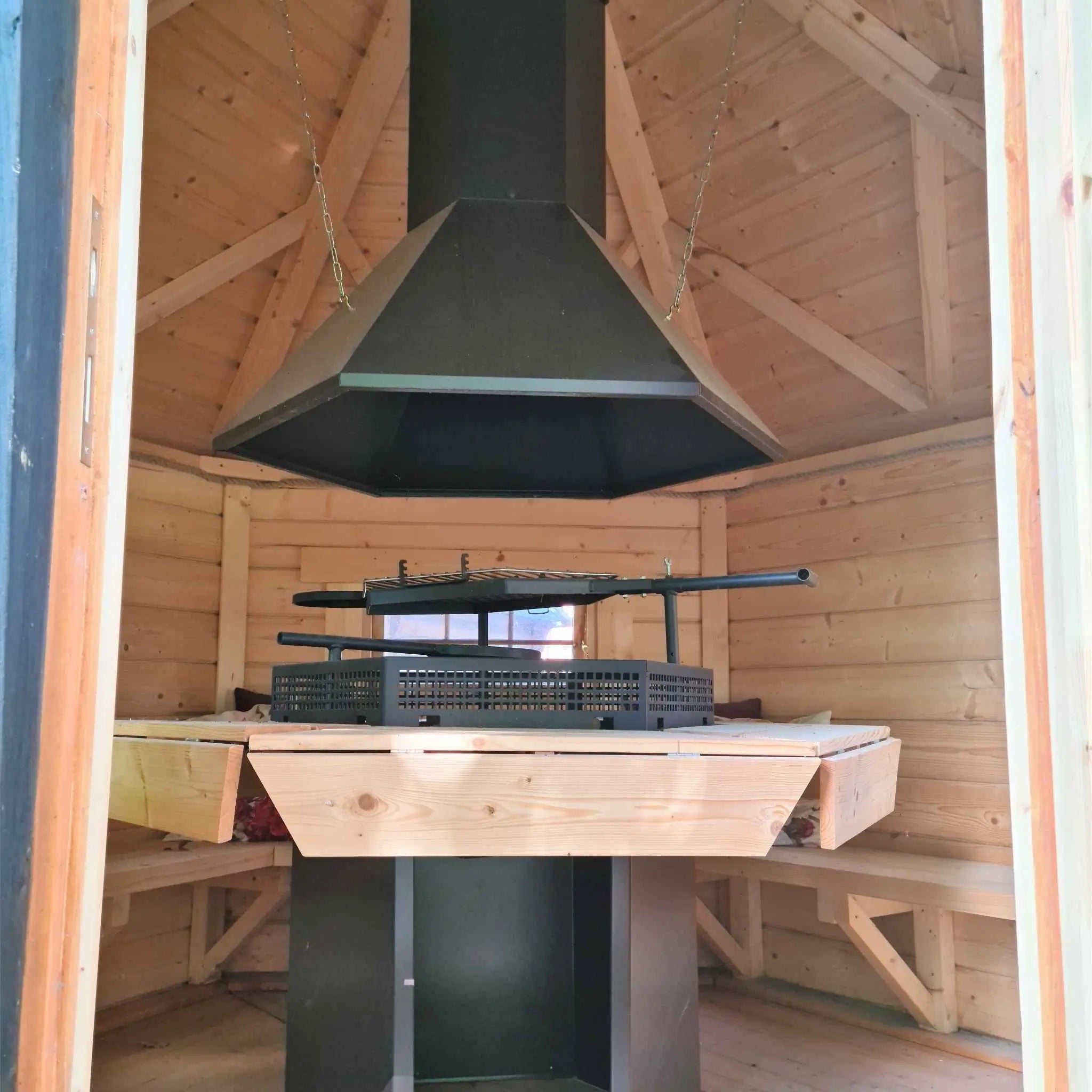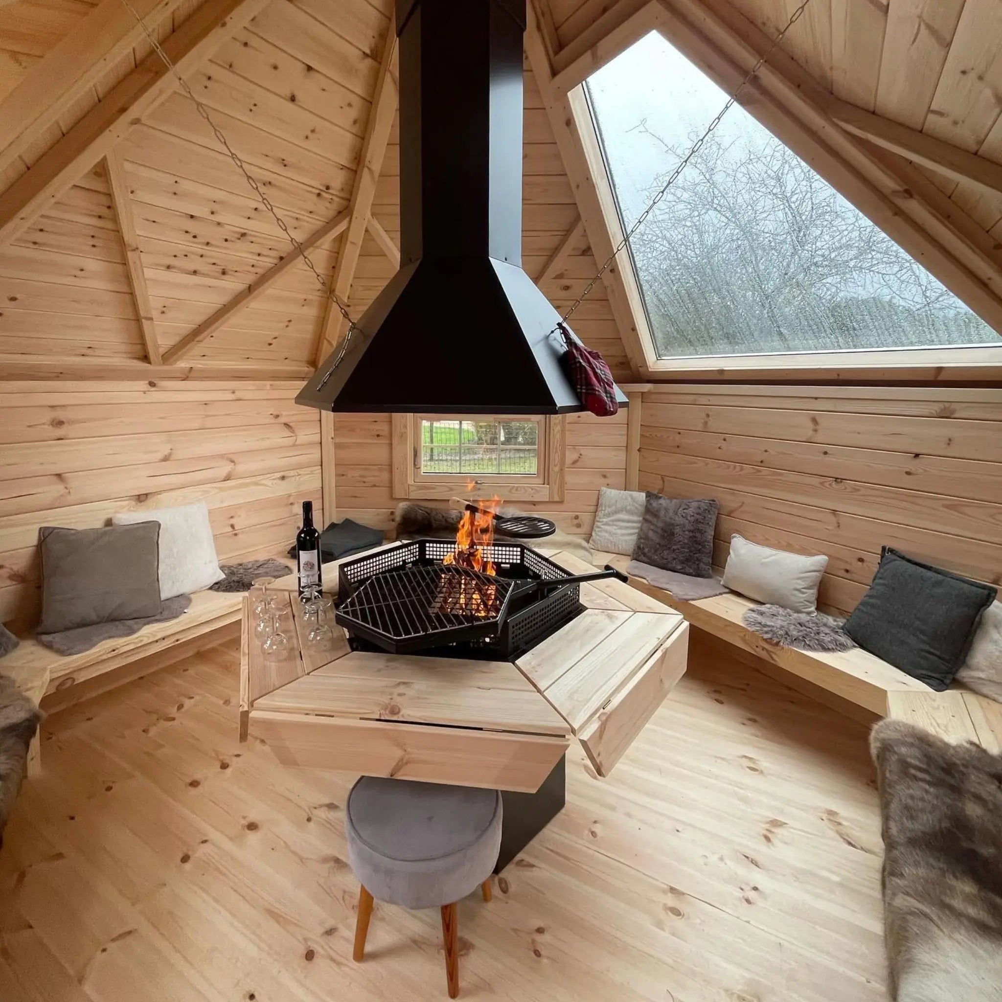 Double‑glazed windows allow natural light in while keeping warmth inside. The central fire adds a welcoming glow, creating a perfect atmosphere for relaxing evenings. Cushioned seating makes it easy to linger, chat, and dine in comfort.